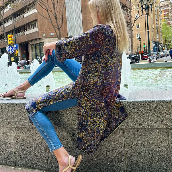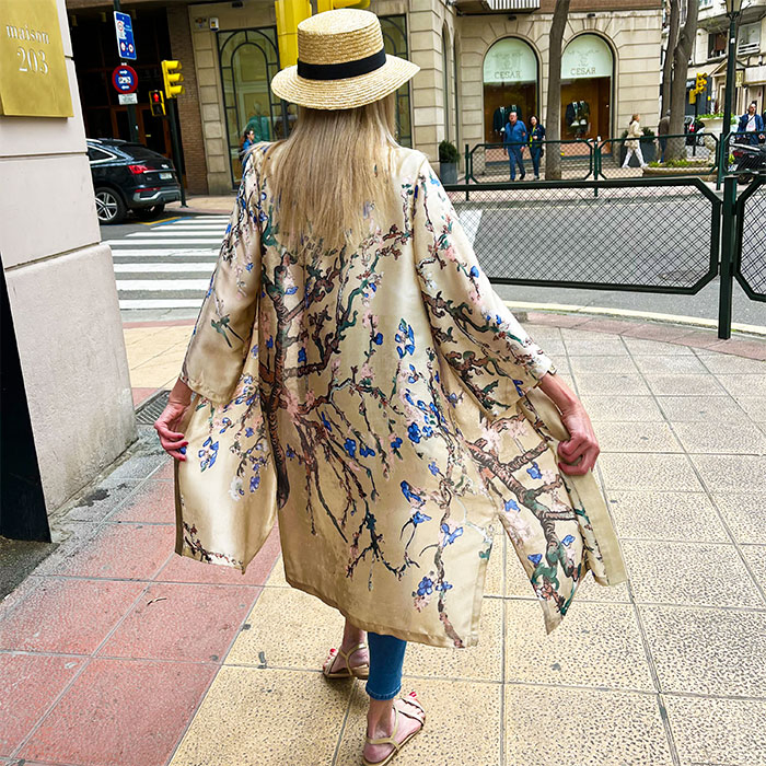 El kimono tiene siglos de historia, pero ha sabido reinventarse sin perder su esencia. Hoy es símbolo de libertad, elegancia y expresión personal. Lo vemos en pasarelas, en editoriales de moda y, sobre todo, en mujeres reales que lo usan para trabajar, salir, viajar, una boda o evento especial o simplemente para sentirse bien consigo mismas. Su diseño abierto, su caída ligera y la posibilidad de jugar con tejidos y largos lo hacen perfecto para cualquier momento del año.