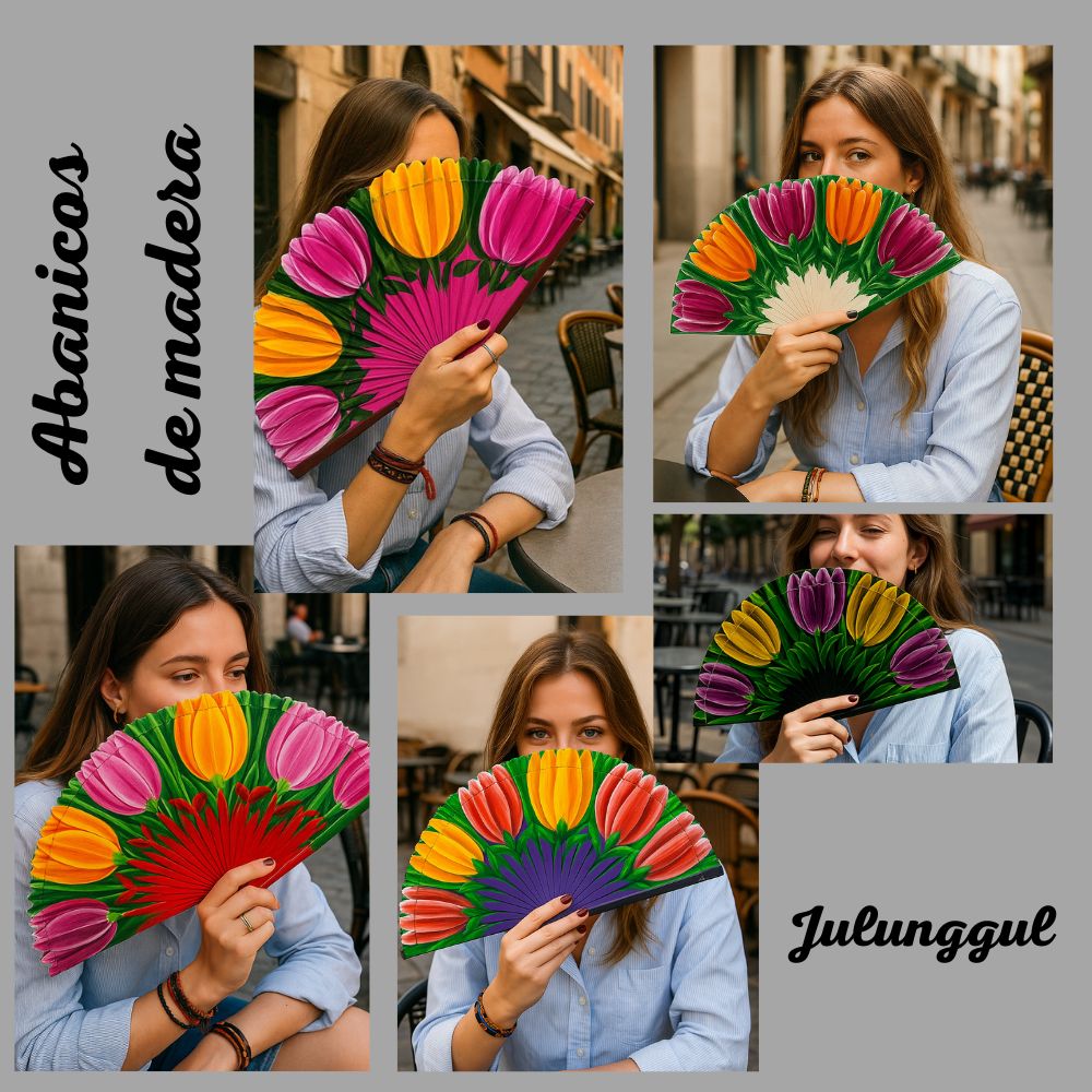 Abanicos de madera Tulipanes de colores con funda en diferentes colores, con su funda de tela de tul para guardarlo sin estropearse en el bolso. Pintados a doble cara