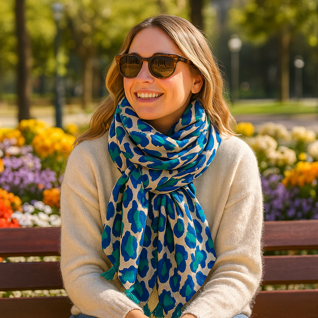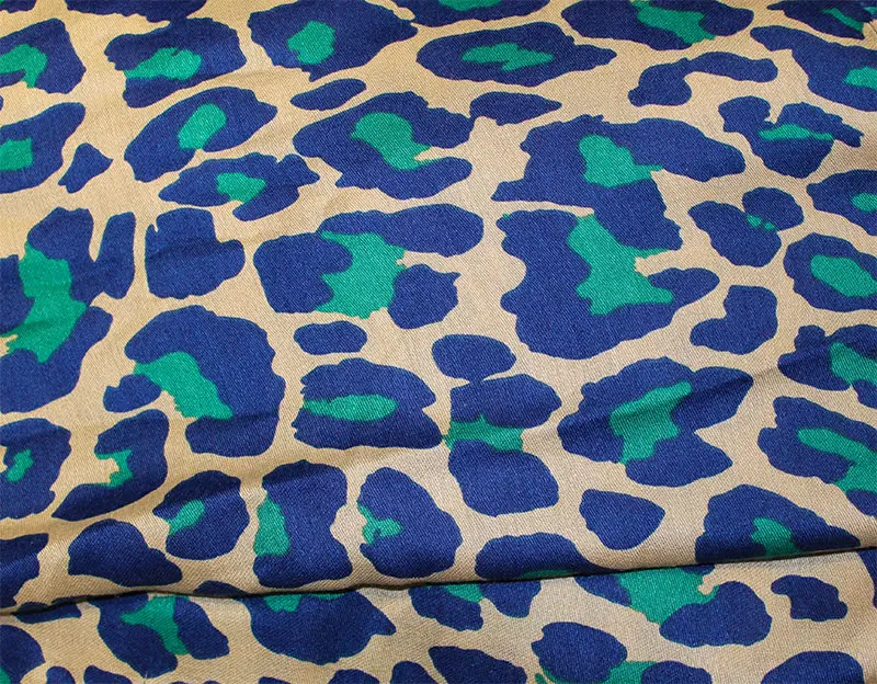 Bufanda de leopardo azul y verde, tcon fondo beige, de medidas 90×2000 cm, para utilizarla de diferentes formas: como chal, fular (foulard), bufanda. Viscosa y algodón, suave y ligera. Mancha tamaño medio