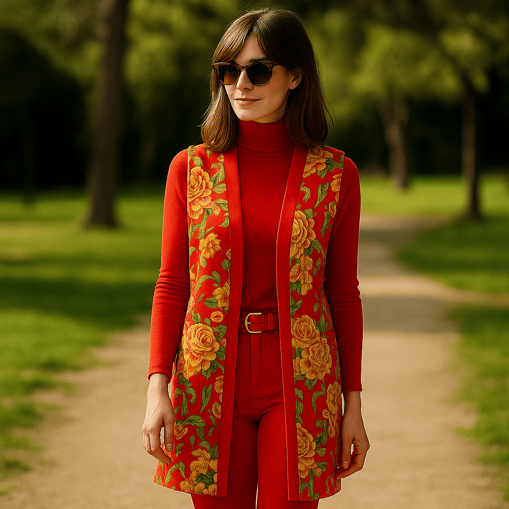 Chaleco rojo de cretona de flores. Puede ser con forro de semiseda, y puede ser terciopelo, punto, frannela,…Precio según forro, dedse 119,5 €