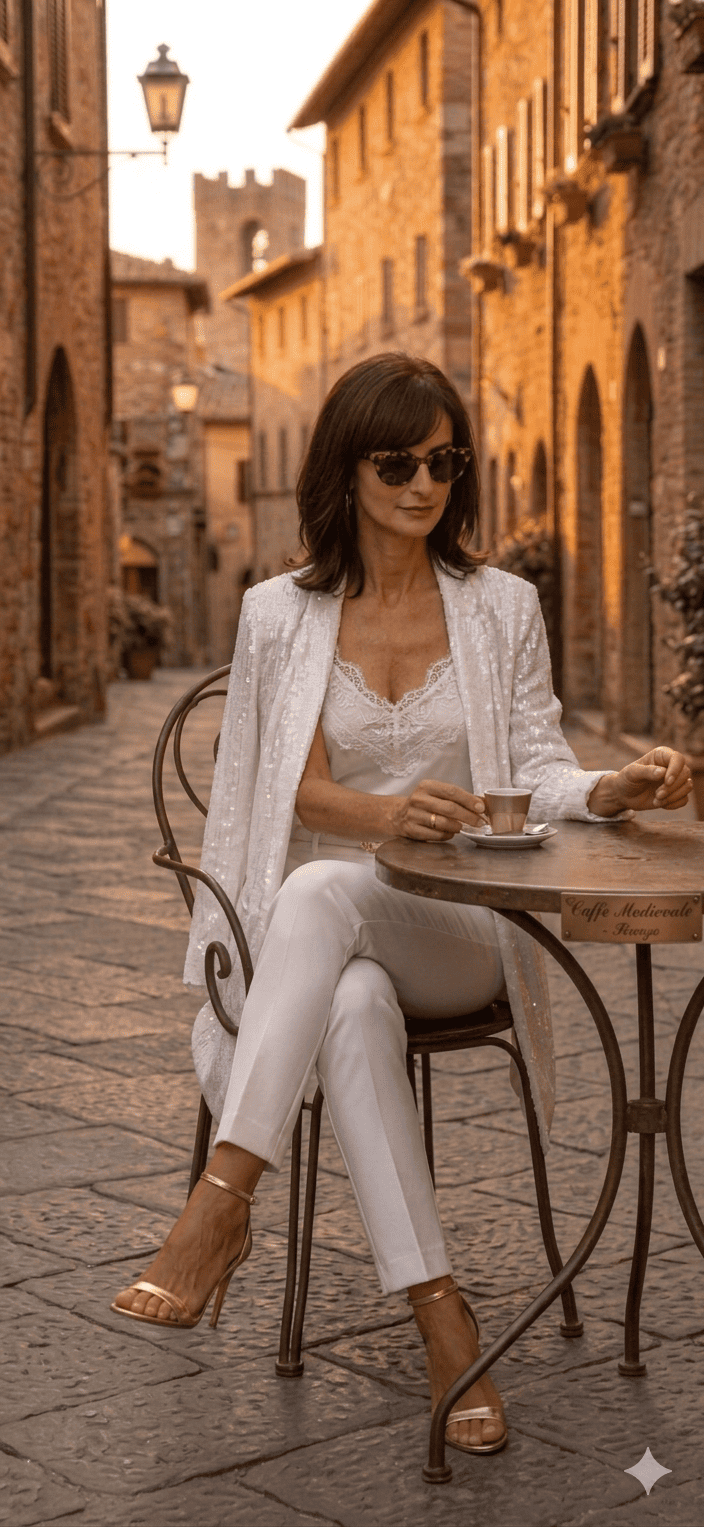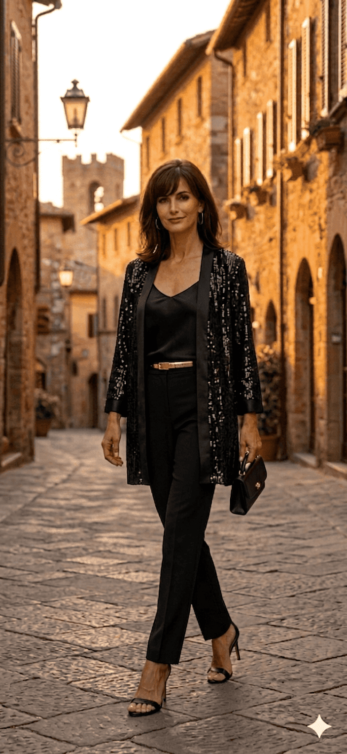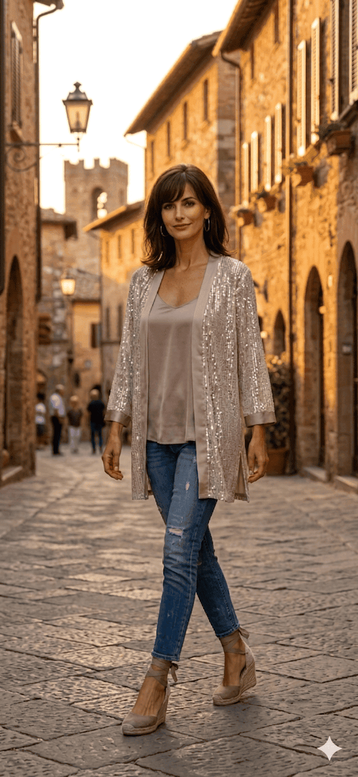 Chaqueta de Lentejuelas y Top Lencero de Seda