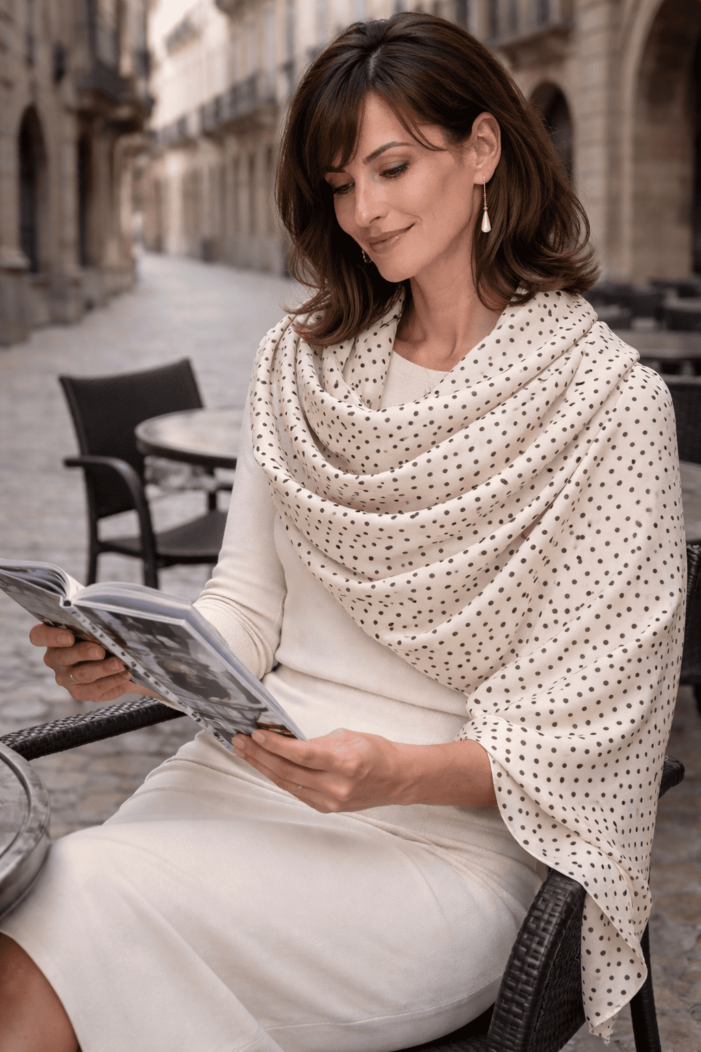 Elige y regala Fular de seda con forro reversible beige con lunares negros y muchos más estampados Julunggul.