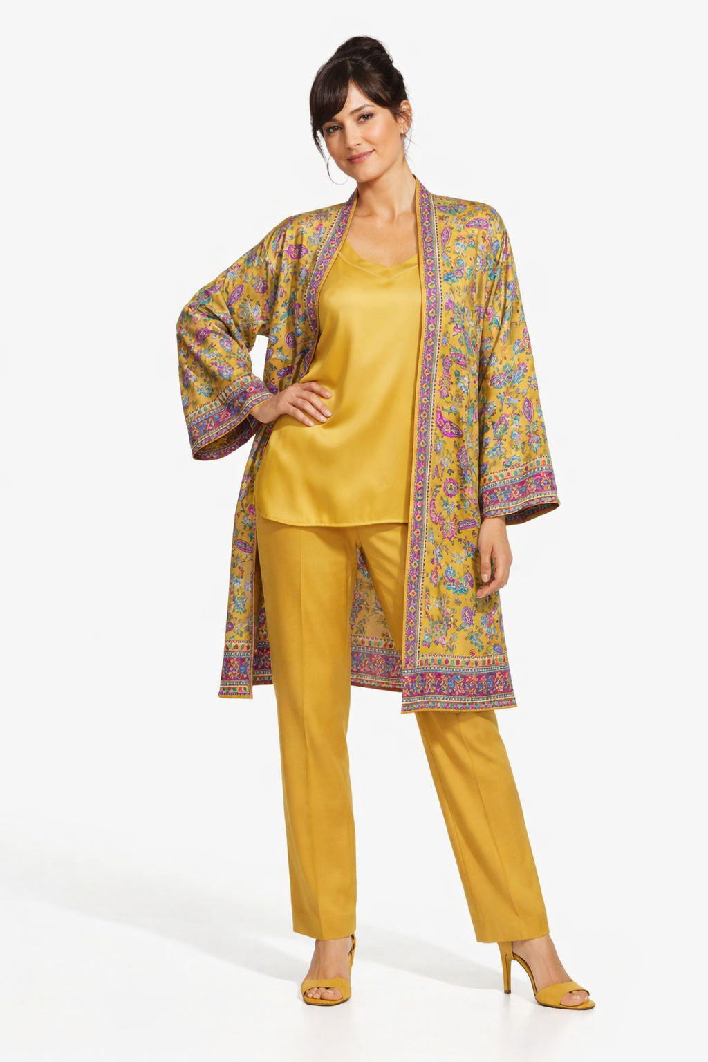 Kimono de seda estampado mostaza con cenefas y top a juego opcional.