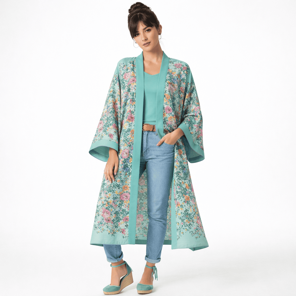 Kimono de semiseda largo verde mar con flores. Disponible en otros colores.