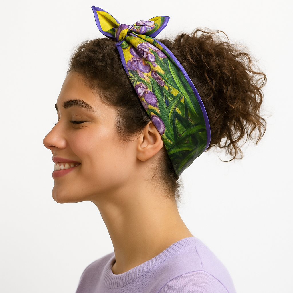 Elige nuestro Pañuelo de seda de mujer Verde y violeta o en otros estampados.